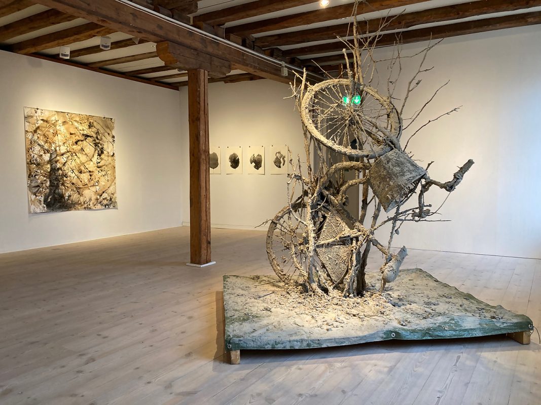 Till utställningen i Hamnmagasinet har jag framställt tusch av material från komposten. Skal, bark, jord och kol har kokats, silats, malts och pulveriserats. Färgerna har sedan applicerats på stora pappersark, släpats runt i en varsam lek mellan slump och kontroll som framkallat bilder.